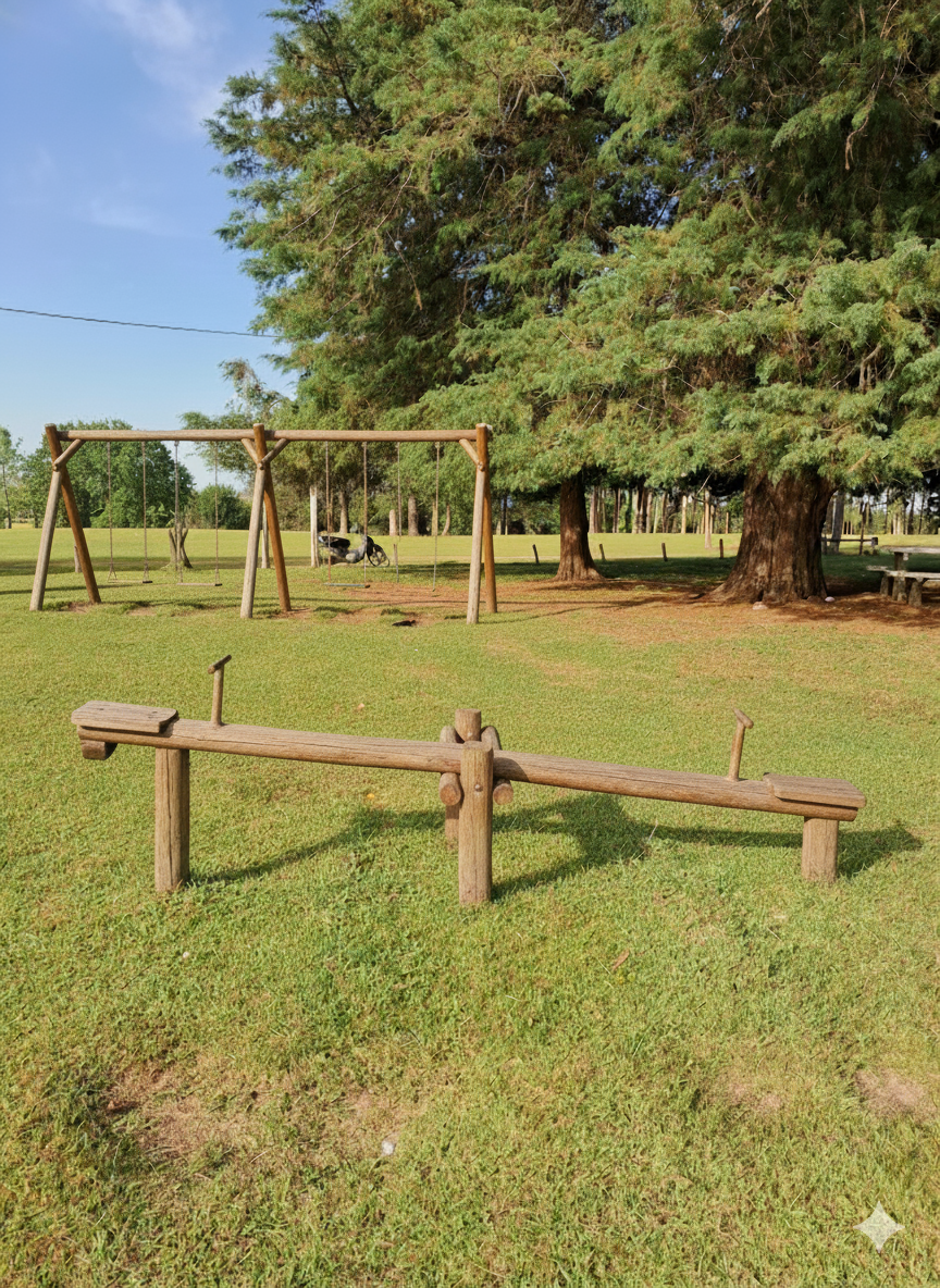 Un espacio pensado para que los niños exploren, se diviertan y gasten energía al aire libre. Los juegos son firmes, seguros y construidos en madera, ideales para trepar, equilibrarse y jugar libremente. Perfecto para que disfruten de una aventura sencilla y natural.